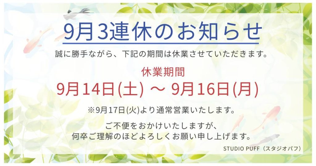 9月3連休のお知らせ 誠に勝手ながら、下記の期間は休業させていただきます。 『休業期間』 2024年9月14日(土) ~ 9月16日(月) ※9月17日(火)より通常営業いたします。 ご不便をおかけいたしますが、何卒ご理解のほどよろしくお願い申し上げます。 -